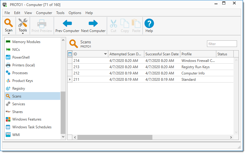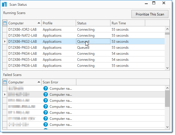 You can view the status of scans in progress, find information about failed scans, view other scan-related data on any collection page, and prioritize scans, in the Scan Status window, and in the Computer window on the Scans page. When scans fail, PDQ Inventory helps you diagnose the problem by providing a reason for the failure and a link to the failed scan More Info window. For details, see More Info: Failed Scans.