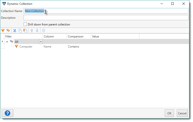 IMPORTANT: If the Drill down from parent collection is checked and the subcollection is moved away from its original parent collection, the subcollection will only filter from the members of its new parent collection providing for different results. If the collection is moved so it has no parent collection, the All Computers collection becomes the default parent.