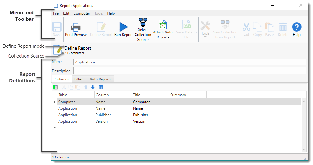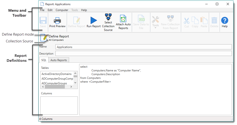 All report types are created and edited in the Report window using Define Report. This window contains the Menu and Toolbar, the collection source, and report definitions. The options available in the report definitions depend on the report type selected. A Basic Report and a Report from Collection includes tabs for Columns, Filters, and Auto Reports. A SQL Report includes tabs for SQL and Auto Reports. The Columns, Filters, and SQL tabs are used to specify the data included in the report, and the Auto Reports tab is used to determine whether reports are automatically run on a schedule (Enterprise mode required for Auto Reports). You can also manage aspects of reports on the main console. For information about managing and editing reports see Managing Reports.
