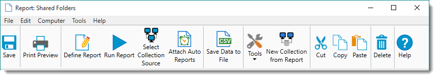 The File, Edit, Computer, Tools, and Help menus provide commands and controls for the report. The Toolbar provides the ability to toggle between defining the report and running the report as well as other quick, context-sensitive access to selected commands.