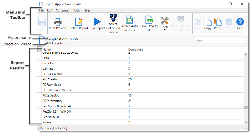 After a report has been defined, the results of the reports are viewed in the Report window using Run Report. With run report, you can change the collection on which the report will run, sort the various columns, print, and even save to a variety of file types for use in other programs. For more information, see Running Reports.