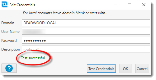 The Test Credentials option is included in the Add and Edit Credentials windows. This option only tests the username and password on the specified computer. It does not verify that the user account has administrator privileges.