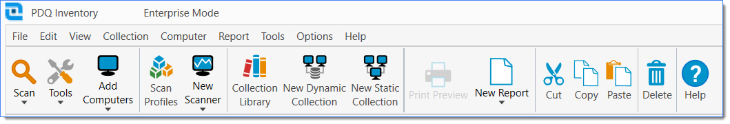 The File, Edit, View, Collection, Computer, Report, Tools, and Help menus provide commands and controls for the components and content you create and edit in PDQ Inventory. The Toolbar provides quick, context-sensitive access to selected commands.